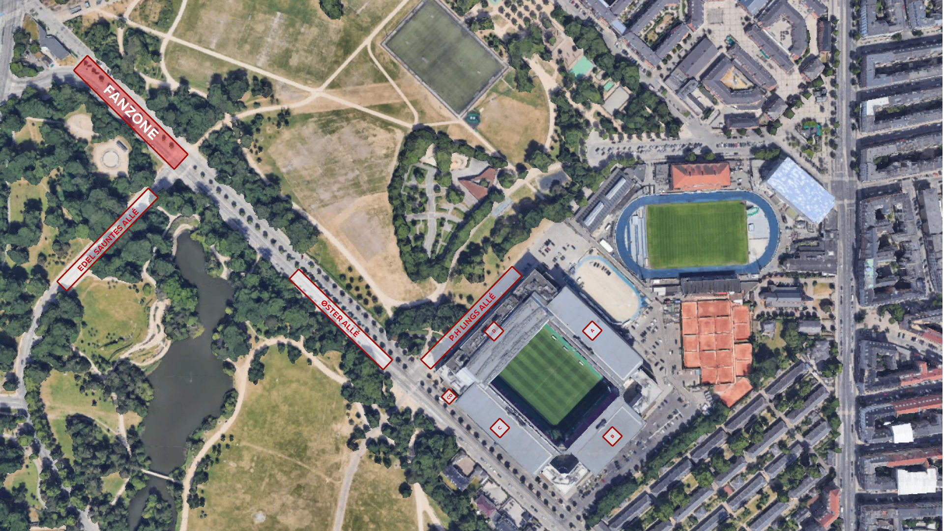 OBS! Grundet omfattende vejarbejde på Øster Allé er fanzonen til kampen rykket ned på stykket mellem Edel Sauntes Allé og Vibenshus Runddel. Se placeringen på kortet herunder.