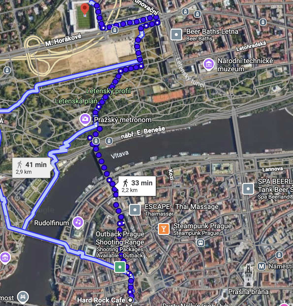 Det tager ca. en halv time (2,2 km) i normalt tempo at gå fra Hard Rock Café til epet Arena. Se eksempel på rute på kortet.