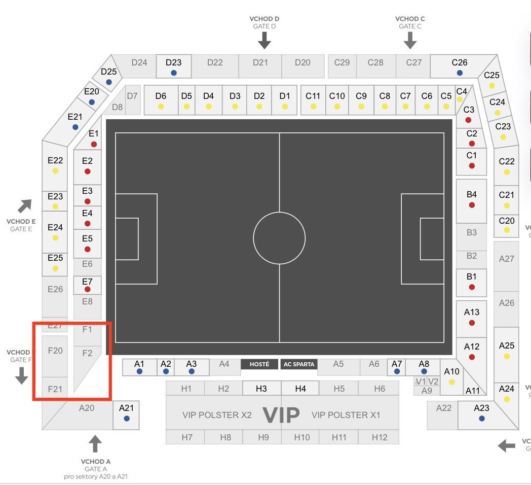 Alle danske fans vil være placeret i sektionerne F1, F2, F20 og F21 på nordtribunen. Se markeret med rødt på kortet herunder.