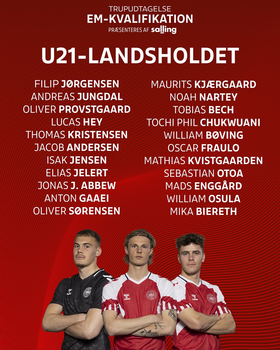 Truppen består af en række erfarne spillere, som har gjort sig bemærket både nationalt og internationalt – flere også med nye, store klubadresser. Patrick Dorgu er desuden blevet rykket op til Herrelandsholdet, men U21-truppen er blevet forstærket med to nye talenter, Noah Nartey og Jacob Andersen, som begge har imponeret i deres klubber og nu får chancen på det danske U21-landshold.