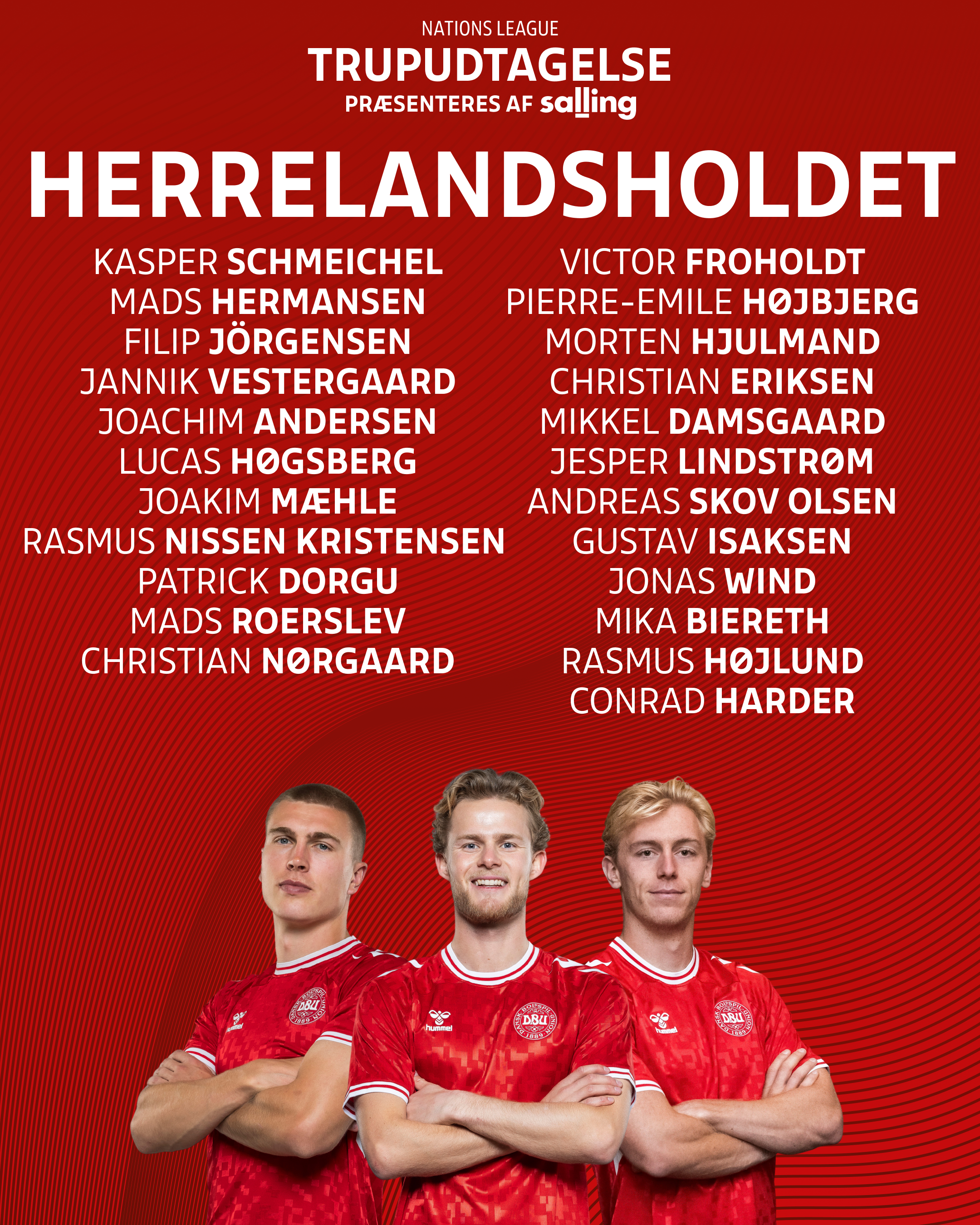 Landstræner Brian Riemer har udtaget 23 spillere, hvor der er velkendte navne som Kasper Schmeichel, Christian Eriksen og anfører Pierre Emile Højbjerg, men også fem helt nye navne.