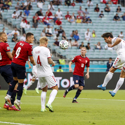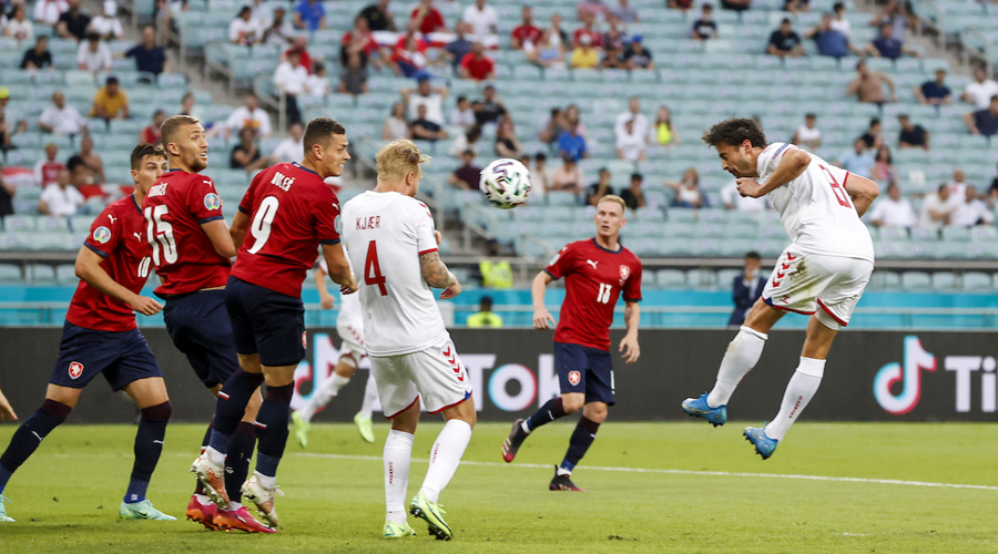 Thomas Delaney header Danmark foran mod Tjekkiet i EM-kvartfinalen i 2021. Foto: fodboldbilleder.dk